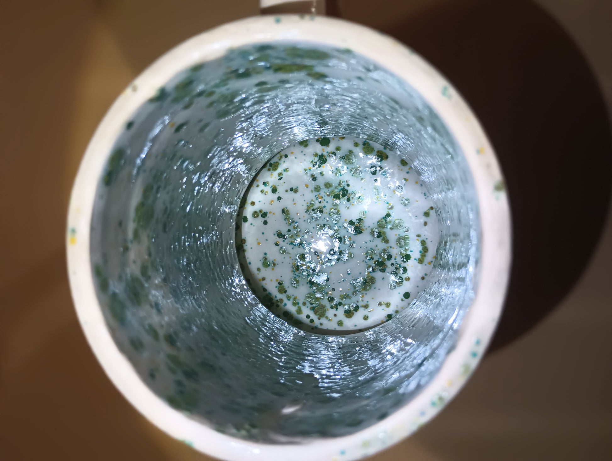 This quirky stein features a beige exterior and a funky green speckled interior, adorned with a playful floral design. Perfect for enjoying your favorite beverages with a touch of whimsy. Cheers!