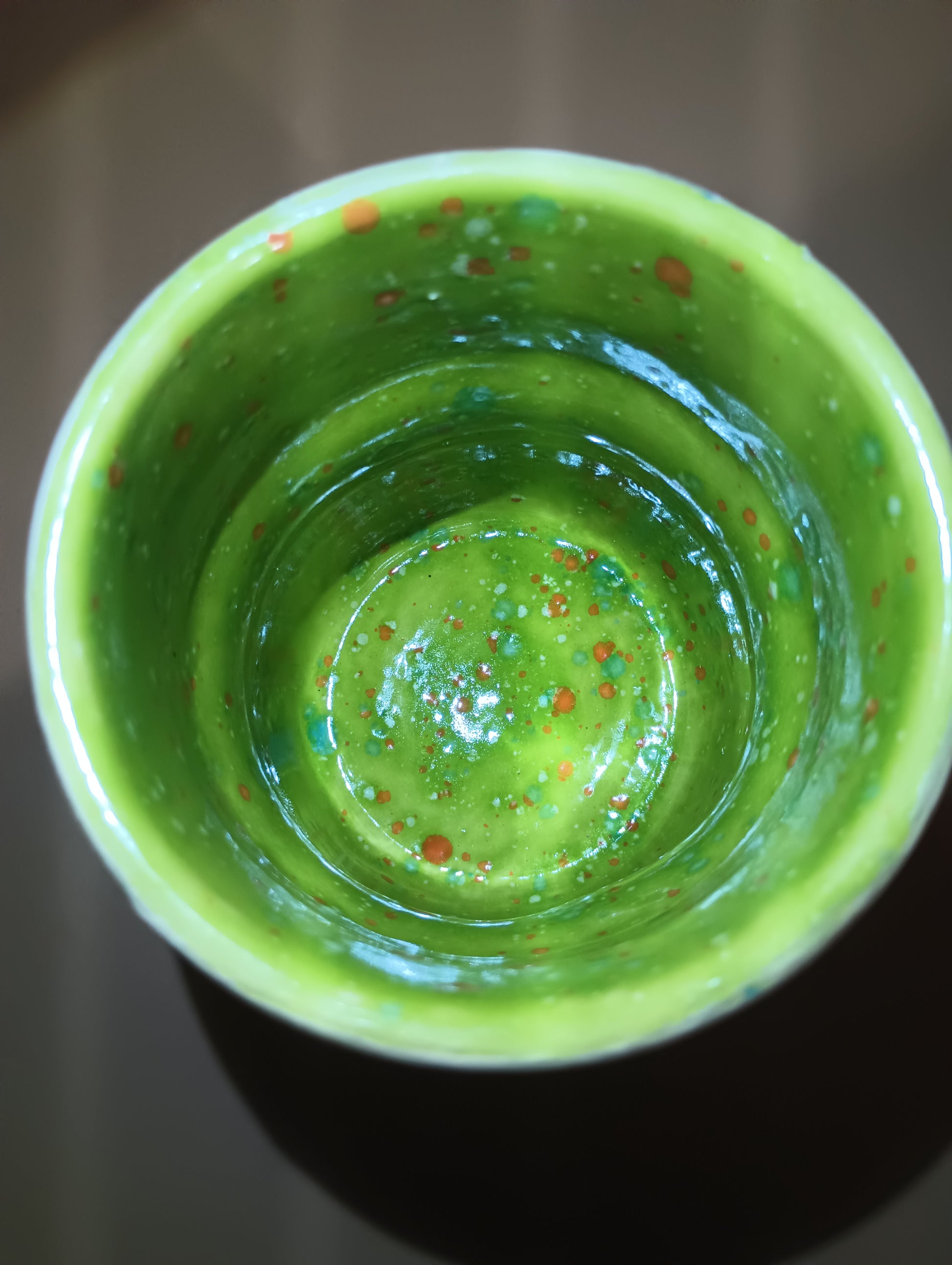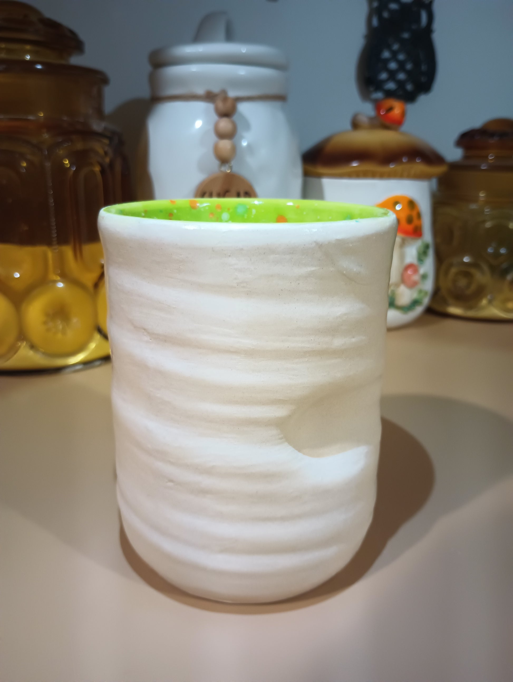 This ceramic mug features a beige exterior, a funky green interior and convenient thumb grips for easy handling. Each mug is hand painted for a one-of-a-kind touch. Upgrade your mug game today!