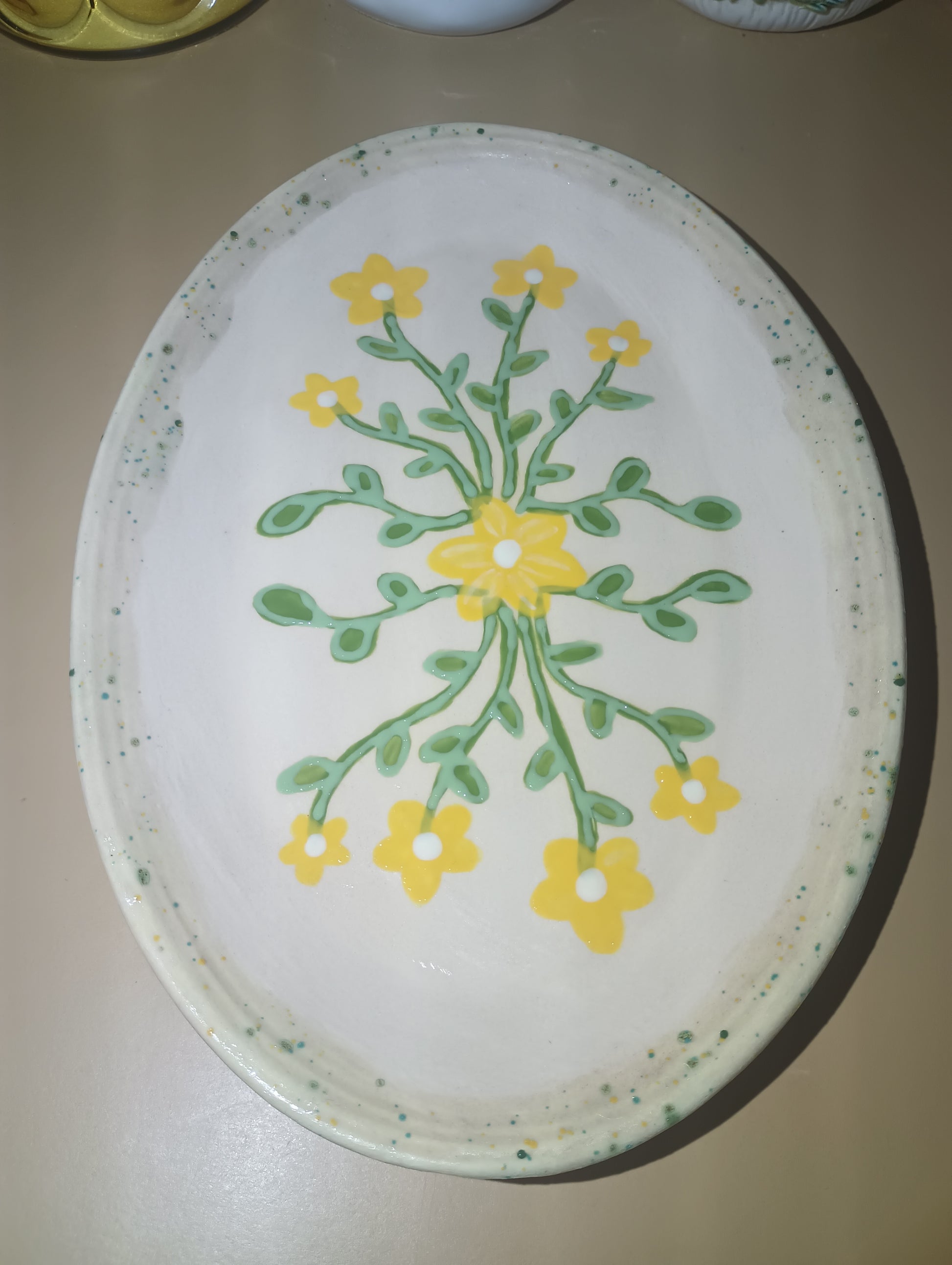 This 12" oval platter boasts a blooming floral design in warm shades of yellow and green against a neutral beige background. Perfect for serving up a charming display of delicious treats at your next gathering. Brighten up your table with this playful and pretty platter.