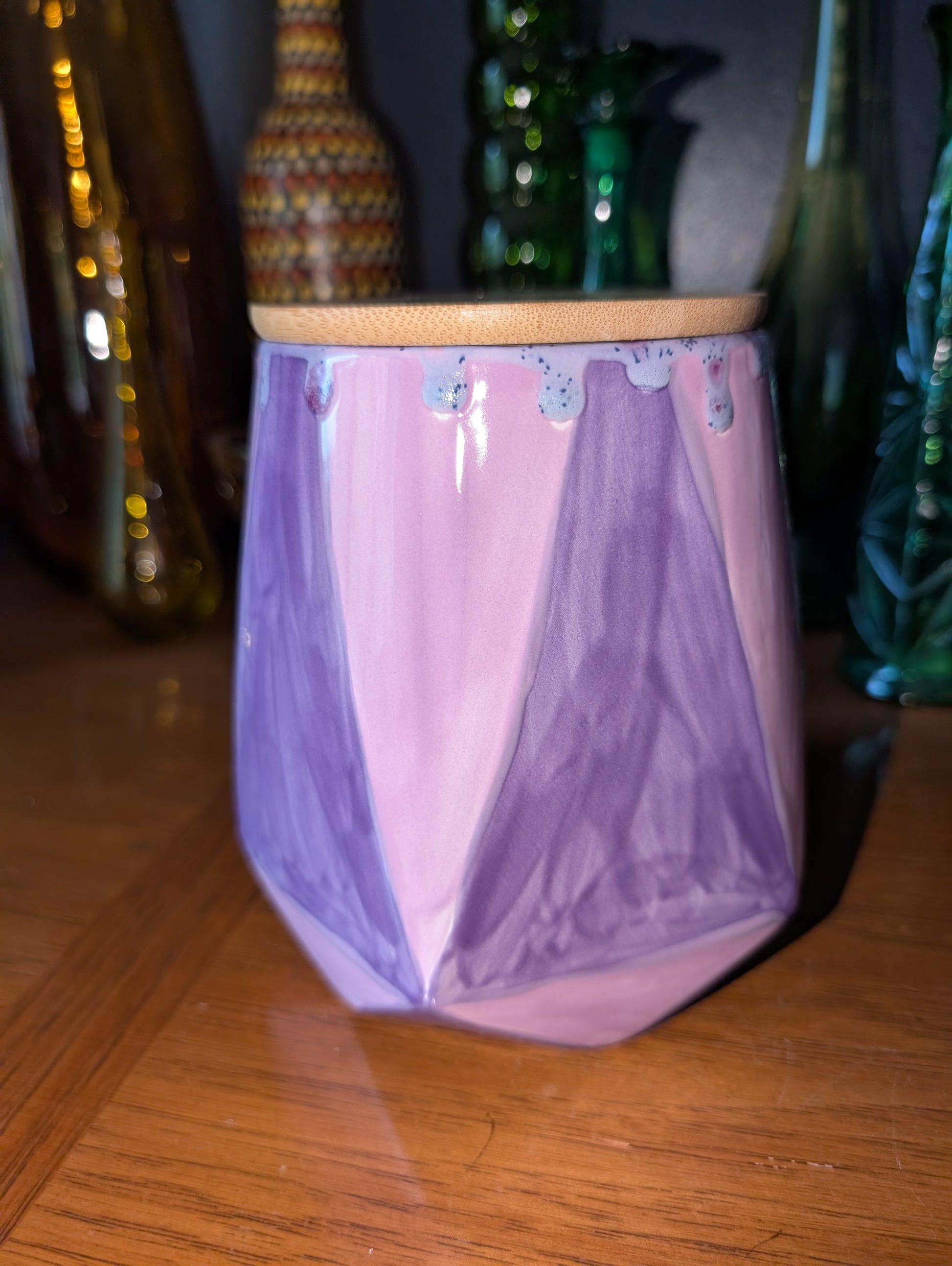 Keep your knick-knacks and snacks stylishly stashed in this playful ceramic Geometric Container. Its faceted design adds a modern twist, while the bamboo lid brings natural warmth to your space. Perfect for organizing with a pop of personality!